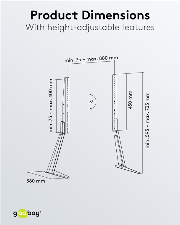 Com seu design minimalista e construção robusta em aço, o suporte para TV economiza espaço enquanto oferece um suporte seguro para TVs e monitores de até 70 polegadas. Graças a um ângulo de inclinação máximo de 6° e 3 níveis de altura, o suporte pode ser ajustado às necessidades individuais. Os cabos de televisão estão discretamente escondidos atrás do painel fornecido no suporte.