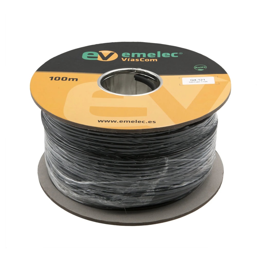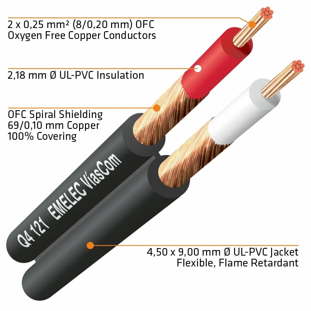Cabo de áudio paralelo composto por dois condutores de cobre OFC com seção de 0,25 mm². Isolamento UL-PVC, blindagem espiral de cobre OFC e revestimento retardador de chamas UL-PVC.