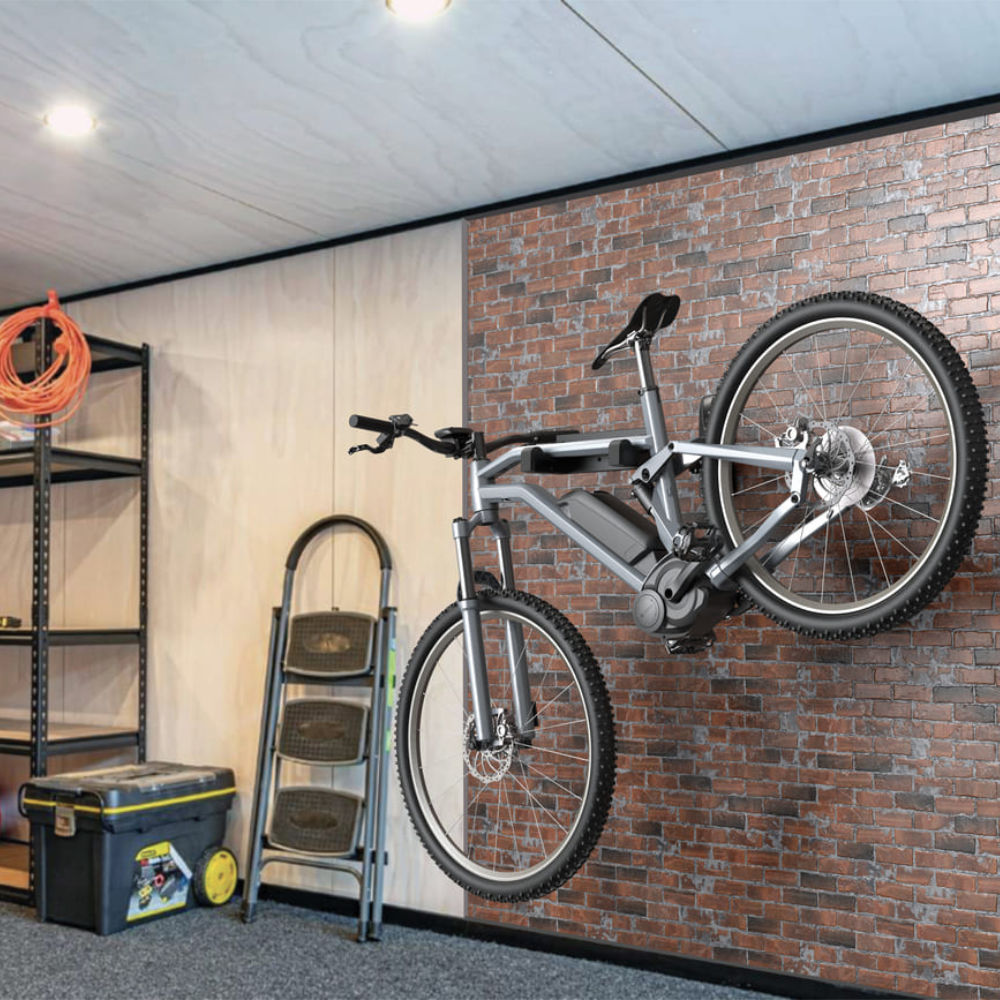 O suporte com economia de espaço e facilmente inclinável permite que se adapte a diferentes tipos de bicicletas. Dobrável na parede, economiza espaço quando não está em uso.